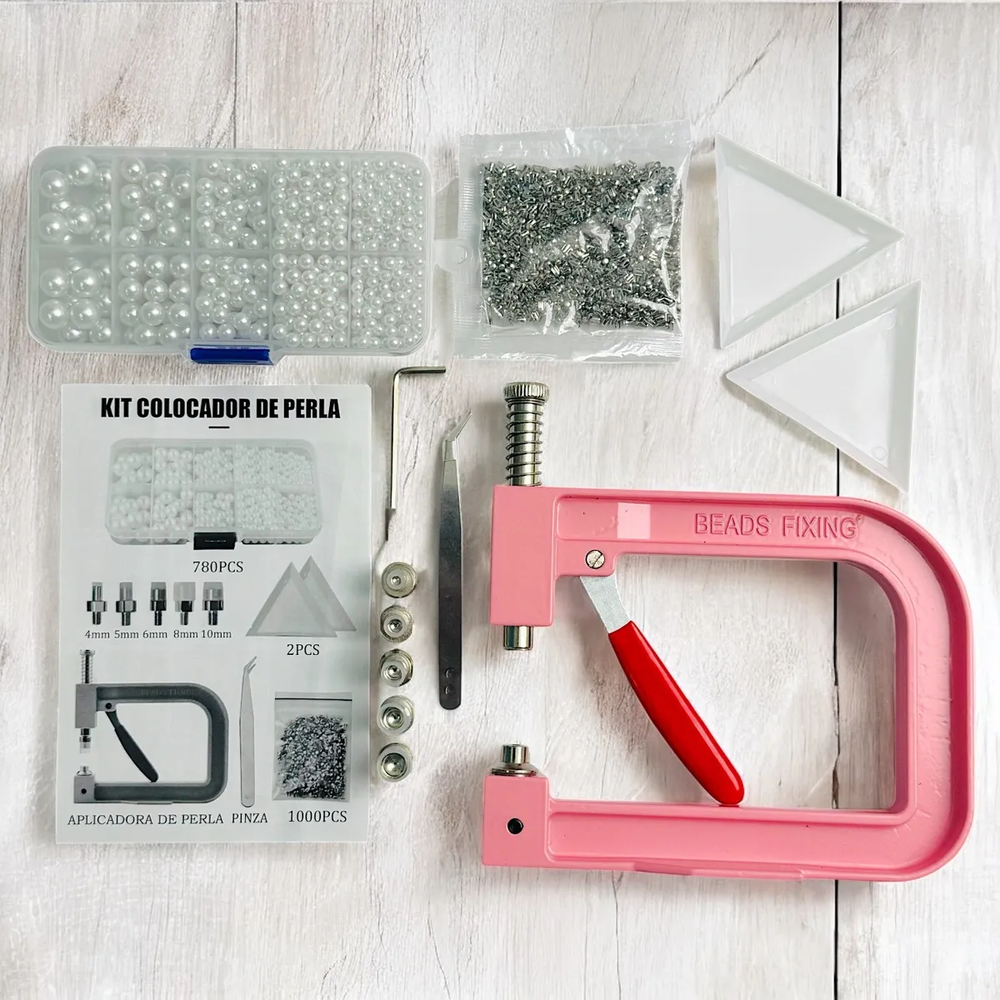 -1 PRENSA/APLICADORA TOTALMENTE METÁLICA -5 MATRICES PARA COLOCAR PERLAS DE 4, 5, 6, 8 Y 10 MM. -780 PERLAS DE DISTINTAS MEDIDAS -1000 TACHAS PARA ANCLAR PERLAS -1 PINZA -2 CONTENEDORES TRIANGULARES