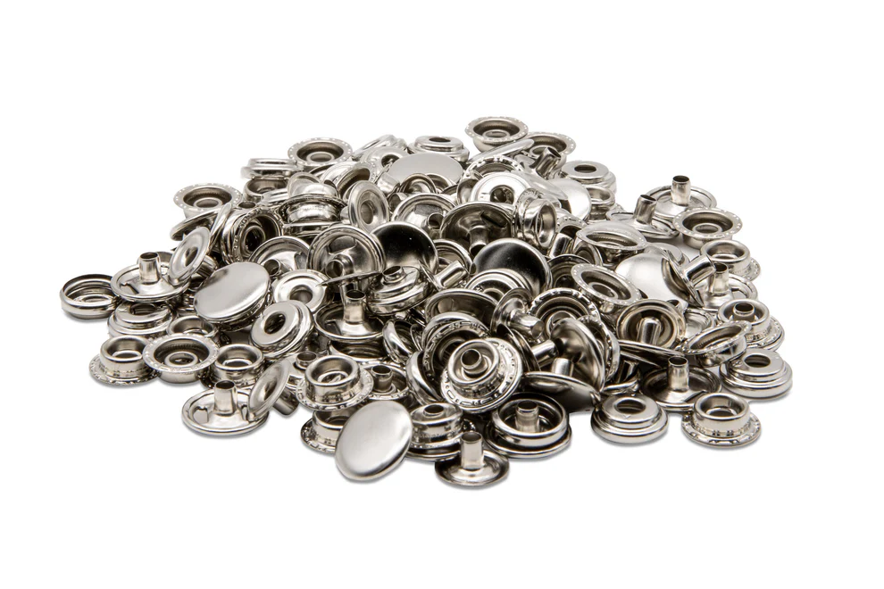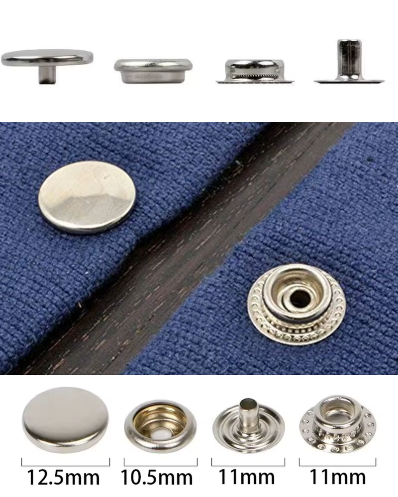 Estos botones a presión, también conocidos como "cuatro en uno", están compuestos por cuatro partes: una tapa, un vástago, un muelle hembra y un muelle macho, que se unen para formar un cierre.
